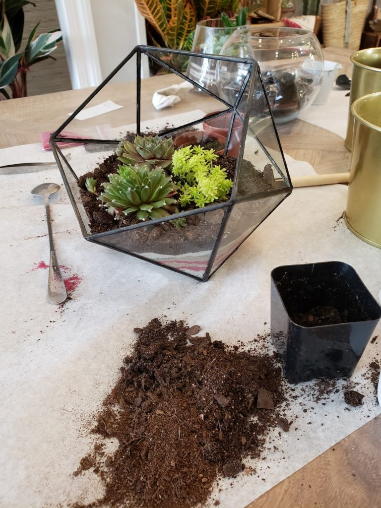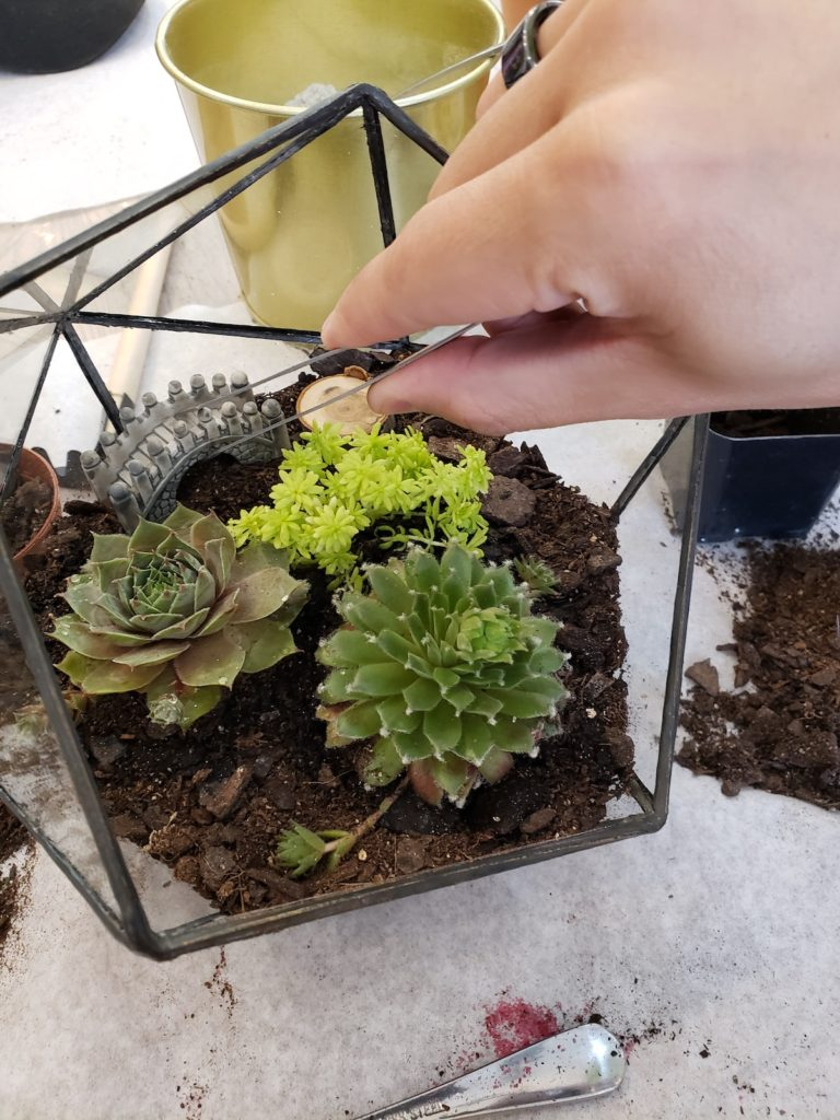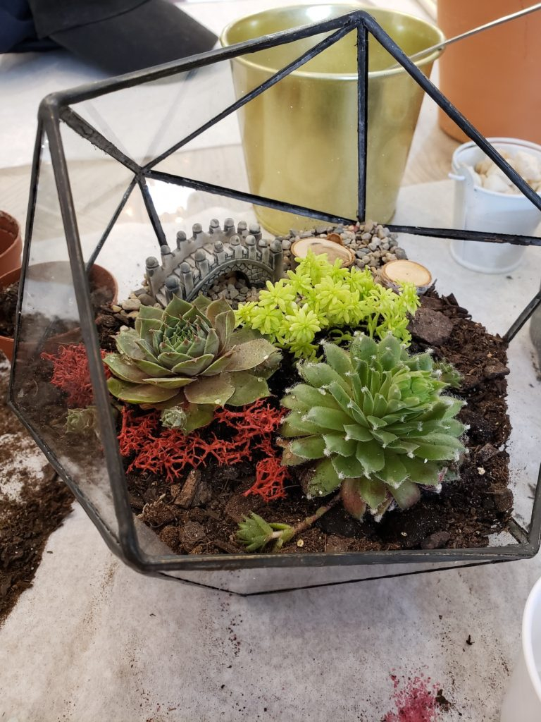 On ajoute un peu de terreau, puis les plantes grasses, une, deux et trois! Quelques cailloux, un petit peu de bois, du lychen, un peu plus de cailloux, un petit pont, un petit hérisson et voilà.