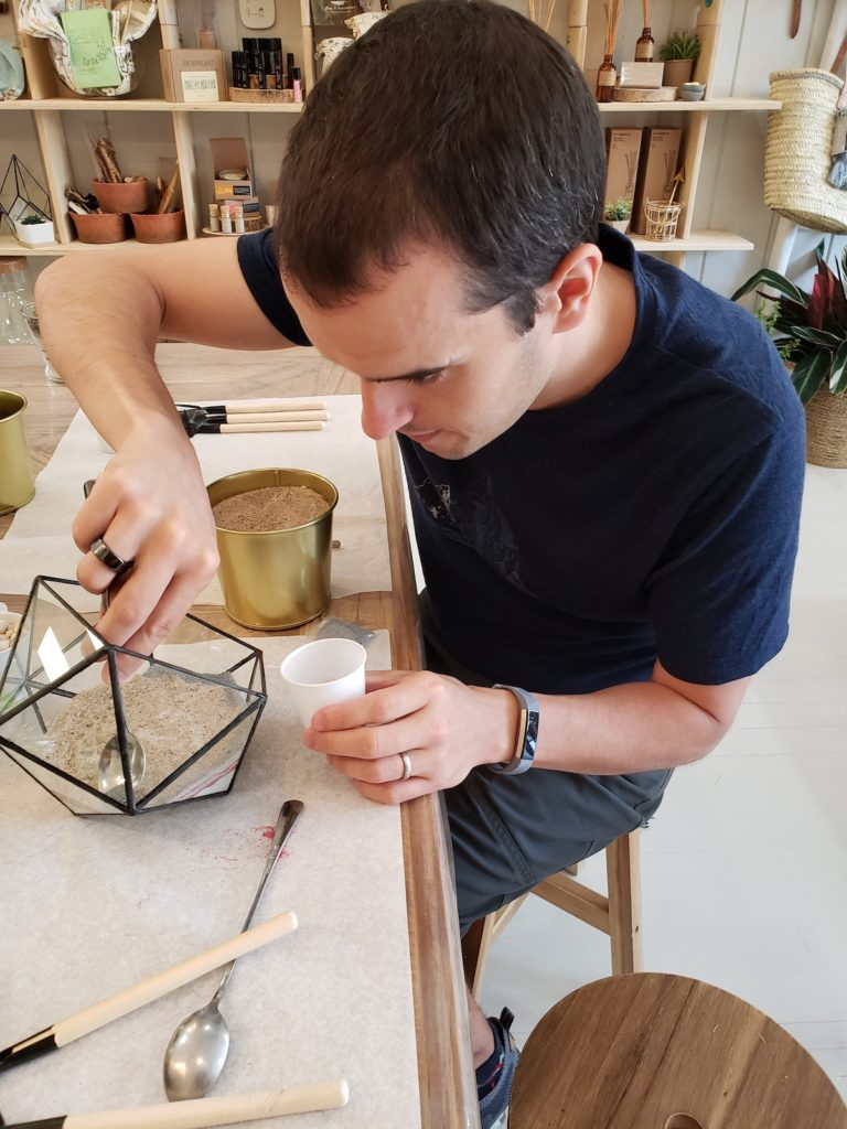Maintenant que tu comprends une partie du titre, je vais oter le mystère de la deuxième partie, le sable. Samedi après-midi nous sommes allés construire un terrarium.